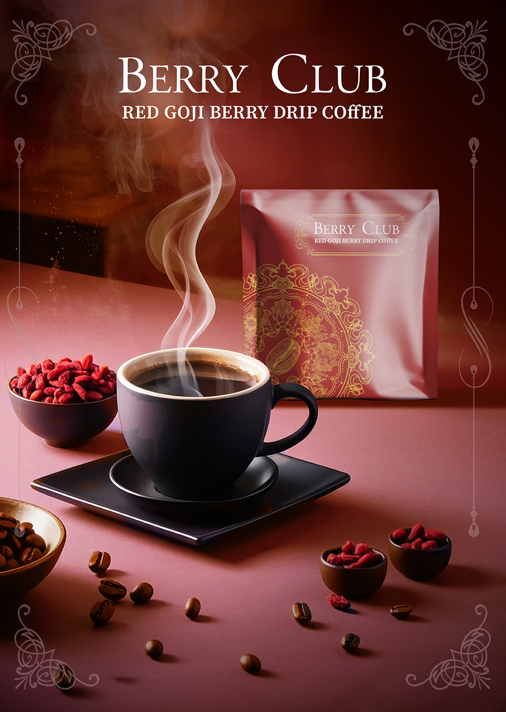 Presented in a matte Red gift box with 8 individually wrapped drip filter sachets, each precisely portioned for one cup and filled with ground coffee and real red goji. Every sachet is nitrogen-flushed and sealed for freshness, transforming the hand-pour ritual into a refined and effortless single-serve experience. The outer box is made from FSC-certified recyclable board and printed with soy-based inks; the drip filter uses biodegradable plant fibres, and each outer sachet is recyclable. We reduce plastic wherever possible, including a thin bio-based inner film that helps preserve aroma while lowering environmental impact. By sourcing red goji through trusted local partners, Berry Club supports responsible cultivation, regional communities and ingredient traceability—so every cup carries not only flavour, but also a clear sense of origin.